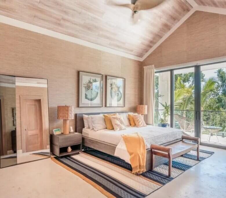The expansive living room opens up to a stunning outdoor area with a covered terrace, a luxurious infinity-edge pool, and a beautifully landscaped backyard offering a tranquil escape. The master bedroom showcases vaulted ceilings, rich textures, and floor-to-ceiling windows leading to a private balcony with picturesque views.