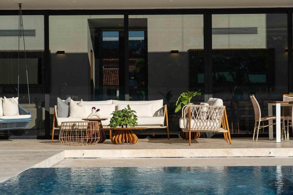 Step outside into the private oasis where you’ll find a beautiful swimming pool surrounded by lush landscaping, offering both shaded and sun-soaked areas for relaxation. The large terrace features comfortable lounge seating and dining spaces, ideal for enjoying alfresco meals with a view.